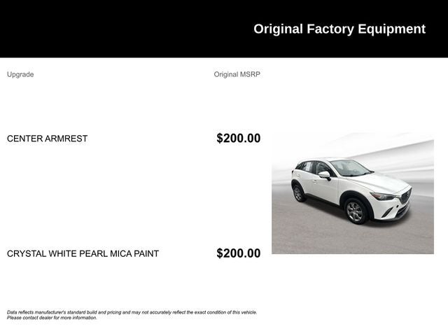 Comfort and convenience are hallmarks of this CX-3, with air conditioning, power windows and door locks, remote keyless entry, and a tilt/telescoping steering wheel. The split-folding rear seats provide versatile cargo-carrying capability, while the alloy wheels and exterior accents lend a stylish, sporty flair.